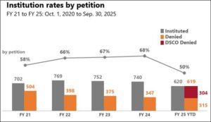 Overall institution rates, as reflected in the FY2025 final statistics, hit a five-year low of 50% in the USPTO’s fiscal year 2025 due in part to the high discretionary denial rate during the Interim Era.