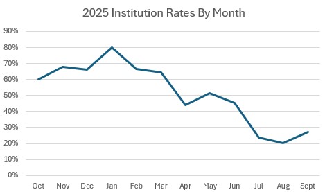 The monthly institution rates show a sharp decline in trial institutions over the last three months of FY2025, with July-September institution rates being 24%, 20%, and 27%, respectively.