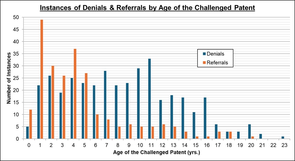 Below is an updated version of the graph from the previous statistical update, which displays instances of denial and referral based on the age of the challenged patent for all 620 cases. The age of the challenged patent is a key factor in every settled expectations analysis.