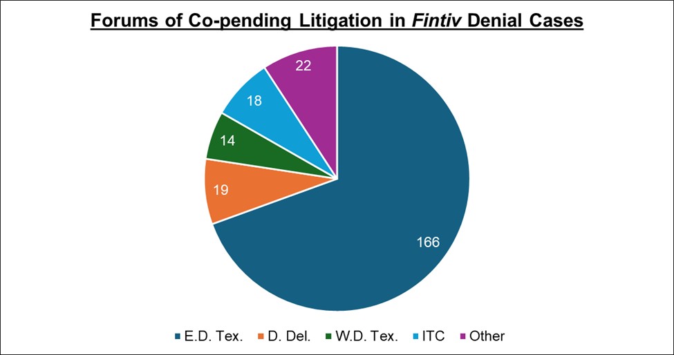 The forum of co-pending litigation affected the outcome of the Fintiv factors in many cases. Quicker filing-to-trial jurisdictions, such as the Eastern District of Texas and the ITC saw the most instances of Fintiv denials.
