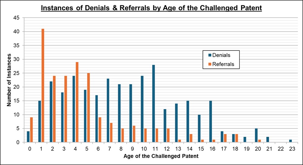As shown above, settled expectations is the most common factor that favors denial in a discretionary denial. Settled expectations depends heavily on the age of the challenged patent. The following graph depicts discretionary denial success as related to the age of the challenged patent. While each petition challenges one patent, the same patent is sometimes challenged by serial petitions. Each challenge counts as one data point, so if a patent was challenged twice, both challenges are represented in the graph. Thus, successful and unsuccessful challenges to the same patent are counted. Each patent’s age is also rounded down to the nearest full year (e.g., a 5-years-and-11-months-old patent is considered 5 years old).