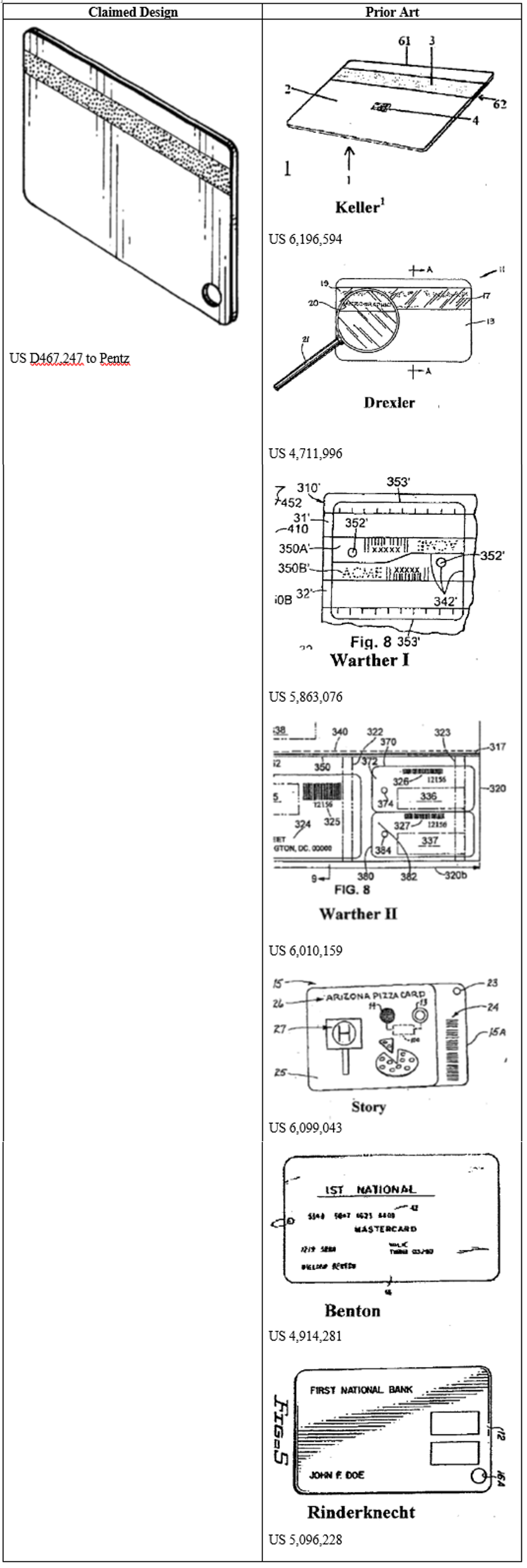 The PTAB also explained some cases where they or the Federal Circuit evaluated whether the primary prior art reference had the right design characteristics to qualify as a primary, or “Rosen reference.” One example was an inter partes reexamination of D467,247 to Pentz (BPAI July 31, 2009, 2009-002973) where the claimed data card design (on the left) was nonobvious because the prior art (on the right, of which Keller and Drexler were proposed as primary references) did not illustrate a data card with both a magnetic strip and an aperture, so there was no proper Rosen reference: