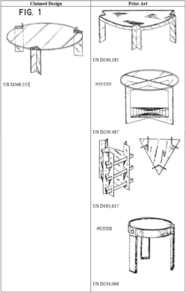 In evaluating the obviousness rejection, the CCPA applied what was at the time a new standard – whether the design would have been obvious to a designer of ordinary skill of the articles involved – now referred to as the “ordinary designer” standard. Additionally, the CCPA established that a primary prior art reference in an obviousness analysis must have “basically the same” design characteristics as the claimed design. As such, under current CCPA and Federal Circuit law, a design cannot be rendered obvious by picking and choosing elements from prior art references, as sometimes can be done for utility patents. In Rosen, none of the prior art had basically the same design characteristics as the claimed design; indeed, modifying D240,185 to achieve the claimed table design would “destroy fundamental characteristics” of its design.