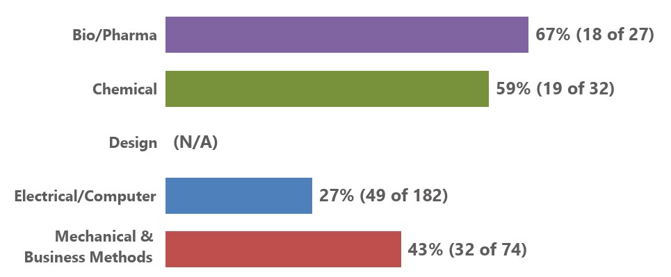 Institution rates for Bio/Pharma (67%) and Chemical (59%) patents have be higher than Electrical/Computer (27%) patent challenges, perhaps attributable to the use of faster venues for asserting high tech patents.