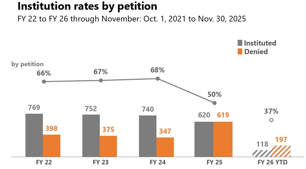 The institution rate for post-grant petitions in FY 2026 through the end of November (the period from Oct. 1, 2025 through November 30, 2025) stands at 37% (118 instituted, 197 denied). As expected, this rate is substantially lower than the previous two fiscal years (50% in FY 2025 and 68% in FY 2024). The November rate was 36% (51 instituted, 90 denied). While these rates are low, they are higher than those observed in mid-2025, where July-September institution rates were 24%, 20%, and 27%, respectively.